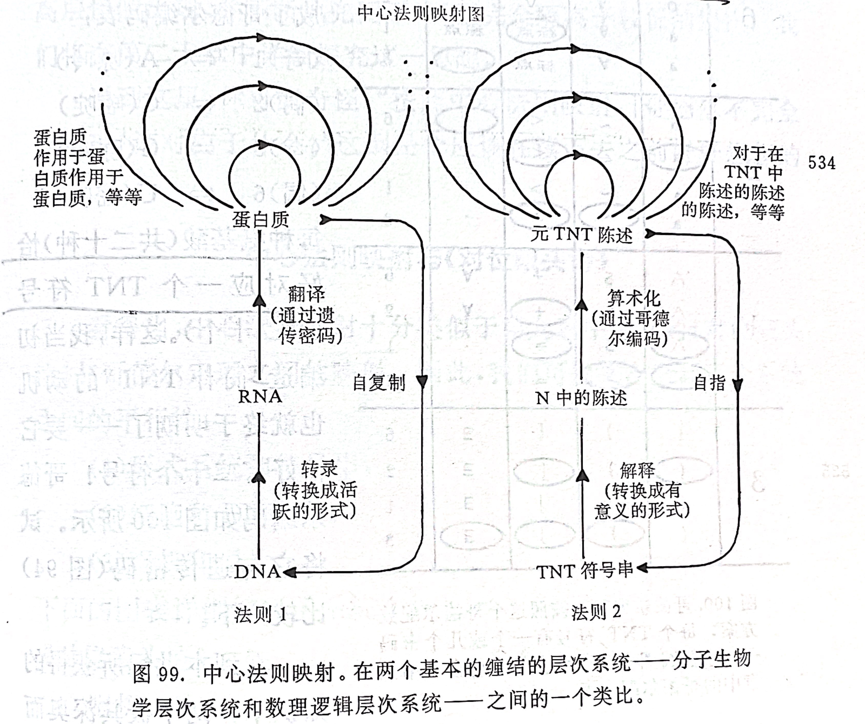 这里最引人注目的就是这个可以无限叠加的大圈,也就是说这个形式系统的运作在这一点上实际上是可以进入非常多不同的层次的。DNA 在这个大圈的某个(或者某几个)高层上可以自我复制,TNT 在这个大圈的某个层次上可以谈论自己。也许智能之所以能成为智能,生命之所以能成为生命,其中的核心秘密就在这个可以跨越无穷层次的规律。