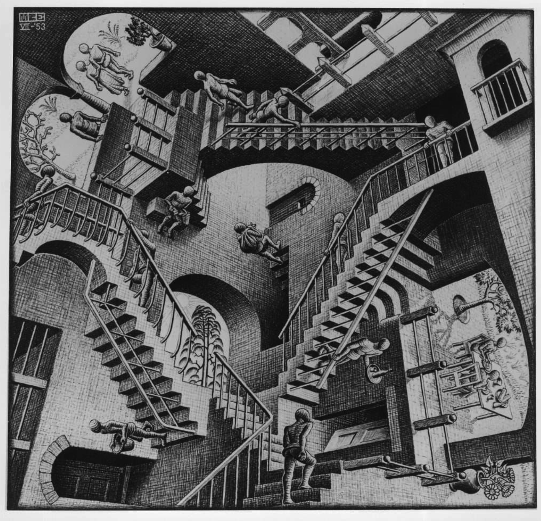 在这幅《相对性》中,确定一个形式系统的意义的过程实际上是用从外部引入的「外部意义」去固定内部的未定项的意义。楼梯的意义是比较明确的一种外部意义,而我们看的过程中需要用借用这种外部意义来理解剩下的部分的意义,但是与 qp 系统这样比较明确的形式系统相比,实际上楼梯之外的未定项无法得出一个「可理解」的系统。